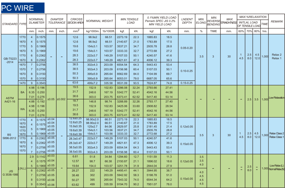 GB/T5223, ASTMA421, BS5896 & EN10138 |